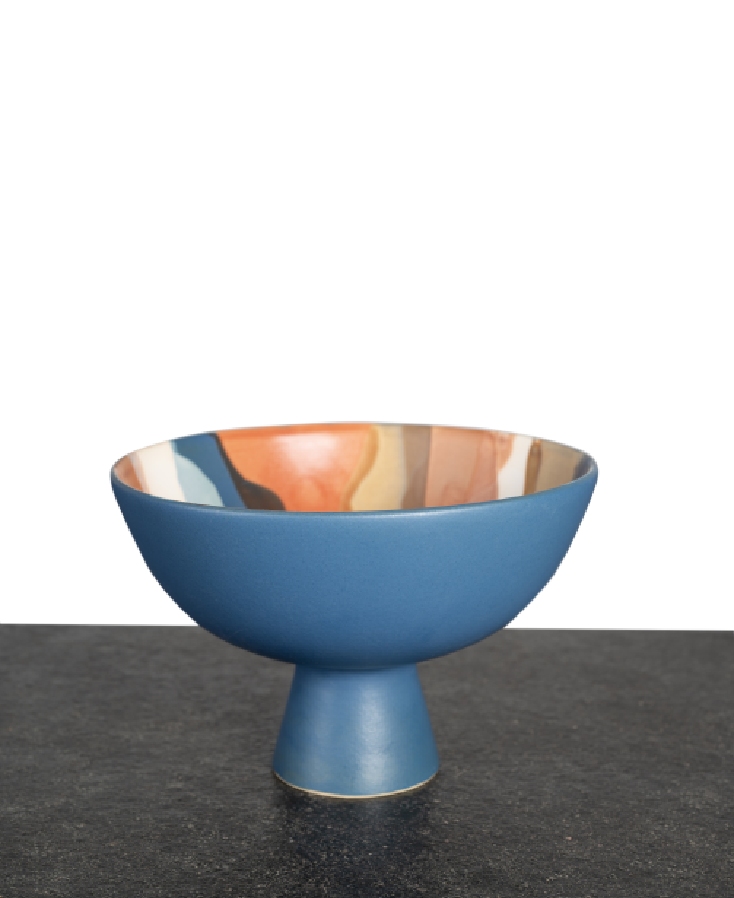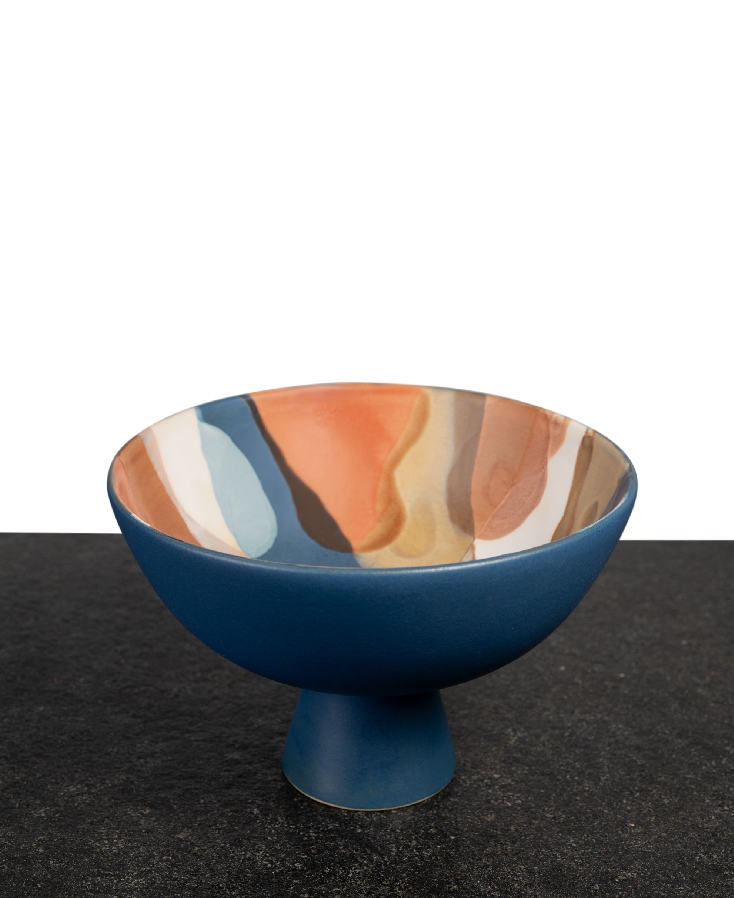 An exquisite fusion of color and form, this ceramic decorative bowl is a statement piece that blends modern artistry with timeless craftsmanship. Its bold pedestal base, finished in a rich matte blue, provides a striking contrast to the vibrant, abstract patterns inside—featuring fluid waves of warm terracotta, soft neutrals, and deep earth tones.